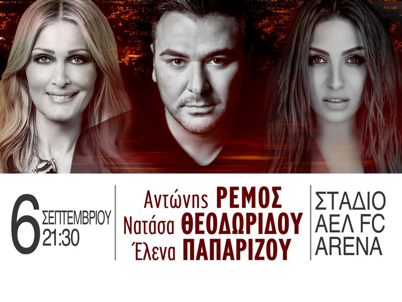 Ο Αντώνης Ρέμος, η Νατάσα Θεοδωρίδου και η Έλενα Παπαρίζου, ενώνουν τις φωνές τους σε μια μοναδική, μεγάλη συναυλία στην Λάρισα, στο Στάδιο ΑΕΛ FC ARENA, την Πέμπτη 6 Σεπτεμβρίου 2018 στις 9.30 το βράδυ.