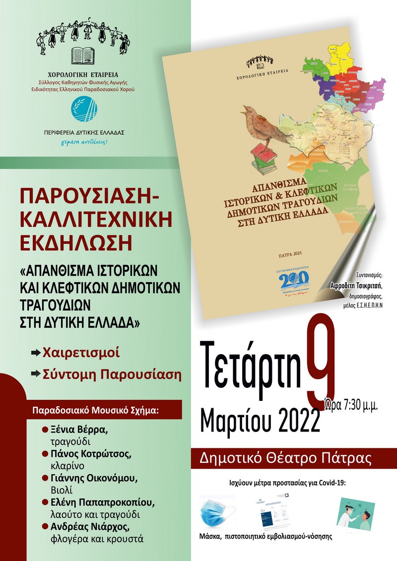 Η Χορολογική Εταιρεία είναι Πανελλήνιος μη κερδοσκοπικός επιστημονικός σύλλογος καθηγητών Φυσικής Αγωγής με ειδίκευση στον Ελληνικό Παραδοσιακό Χορό και με έδρα την Πάτρα. Στο πλαίσιο των ερευνητικών, εκπαιδευτικών και καλλιτεχνικών δράσεών του, την Τετάρτη 9 Μαρτίου 2022, ώρα 7:30μμ. στο Δημοτικό Θέατρο Πατρών με ελεύθερη είσοδο για το κοινό, παρουσιάζει το πρόσφατο βιβλίο που εξέδωσε με τη χρηματοδότηση της Περιφέρειας Δυτικής Ελλάδας, με τίτλο "Απάνθισμα Ιστορικών και Κλέφτικων Δημοτικών Τραγουδιών στη Δυτική Ελλάδα". Τη συγγραφή του βιβλίου επιμελήθηκαν τα μέλη της Χορολογικής Εταιρείας, και στόχος είναι να διανεμηθεί δωρεάν τόσο στα σχολεία της Περιφερειακής Διεύθυνσης Εκπαίδευσης Δυτικής Ελλάδας, ως προσφορά στις σχολικές βιβλιοθήκες, όσο και σε πολιτιστικούς φορείς.