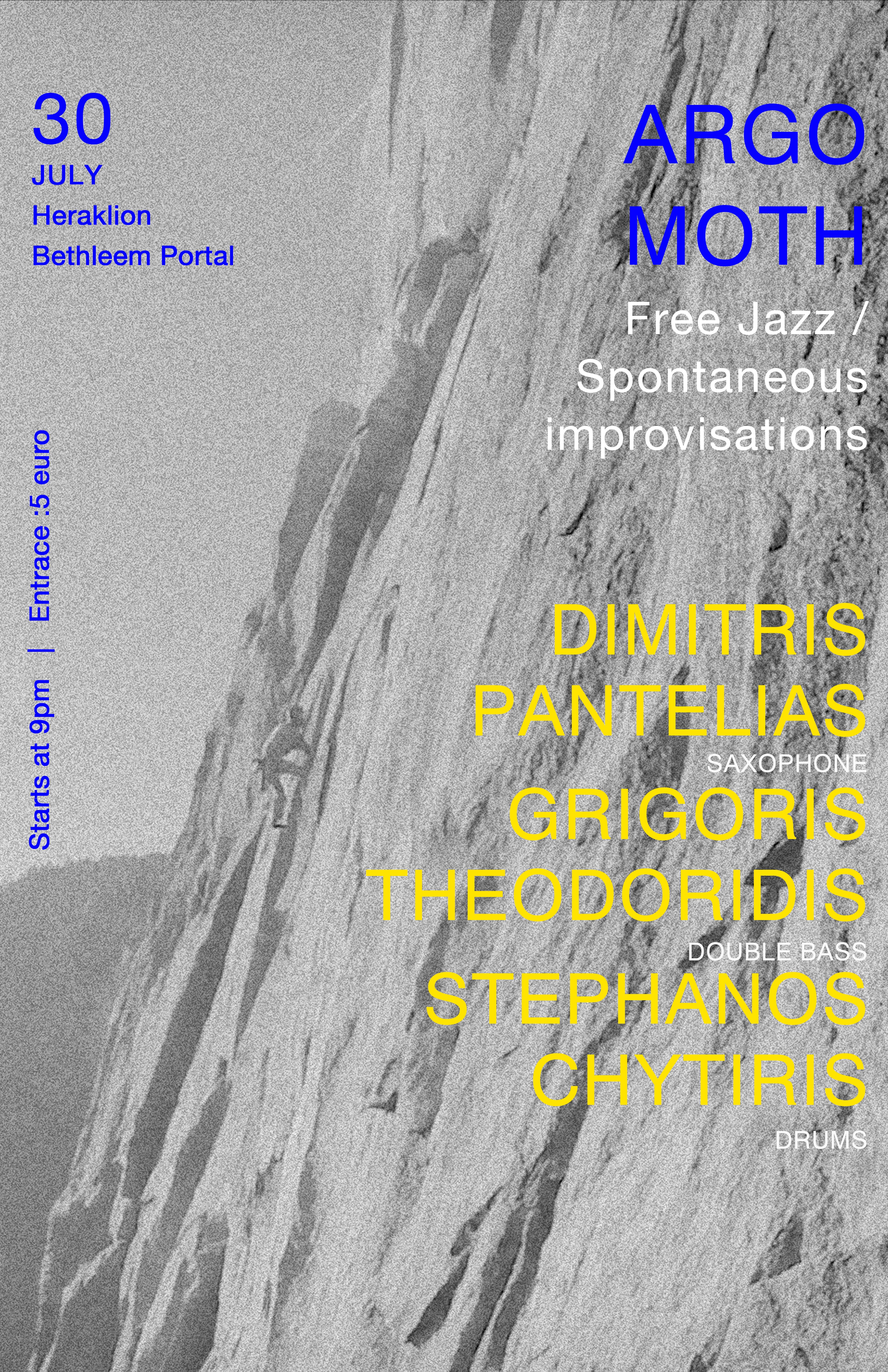 Α musical journey of free improvisation by the explosive trio of Dimitris Pantelias (saxophone), Grigoris Theodoridis (doublebass) and Stephanos Chytiris (drums)