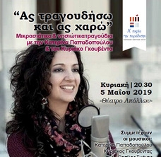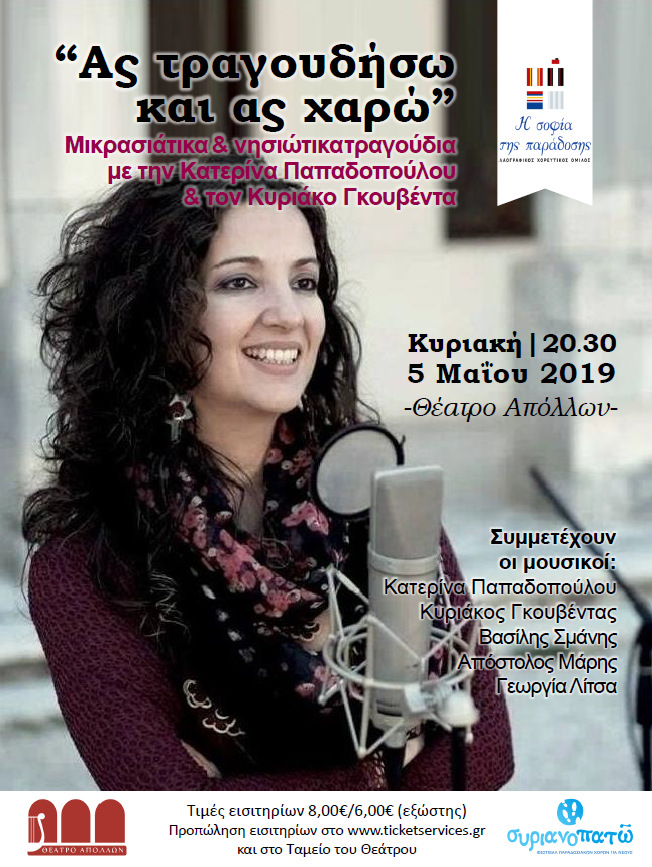 Ο Λαογραφικός – Χορευτικός Όμιλος «η σοφία της παράδοσης» σας προσκαλεί στη μουσική εκδήλωση «Ας τραγουδήσω και ας χαρώ» - Μικρασιάτικα και νησιώτικα τραγούδια με την Κατερίνα Παπαδοπούλου και τον Κυριάκο Γκουβέντα, η οποία θα πραγματοποιηθεί την Κυριακή 5 Μαίου 2019 και ώρα 20:30μμ στο Θέατρο Απόλλων στα πλαίσια του φεστιβάλ παραδοσιακού χορού για νέους «συριανοπατῶ».