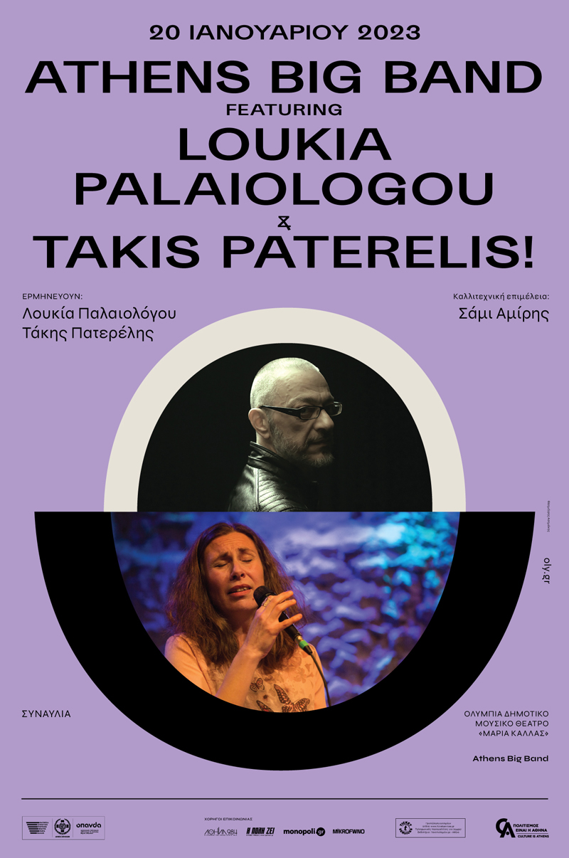 Η Athens Big Band ξεκινά το έτος 2023 συμπράττοντας με δύο από τα μεγαλύτερα ονόματα της ελληνικής jazz σκηνής: την εκπληκτική συνθέτη και ερμηνεύτρια Λουκία Παλαιολόγου και έναν από τους σημαντικότερους Έλληνες μουσικούς της σύγχρονης jazz, με πολλαπλές μουσικές ταυτότητες ως συνθέτη, ενορχηστρωτή, πιανίστα και σαξοφωνίστα, τον Τάκη Πατερέλη. Η μοναδική αυτή σύμπραξη θα διατρέξει το ευρύ φάσμα της jazz ιστορίας από τη χρυσή εποχή της big band μέχρι τις μέρες μας.