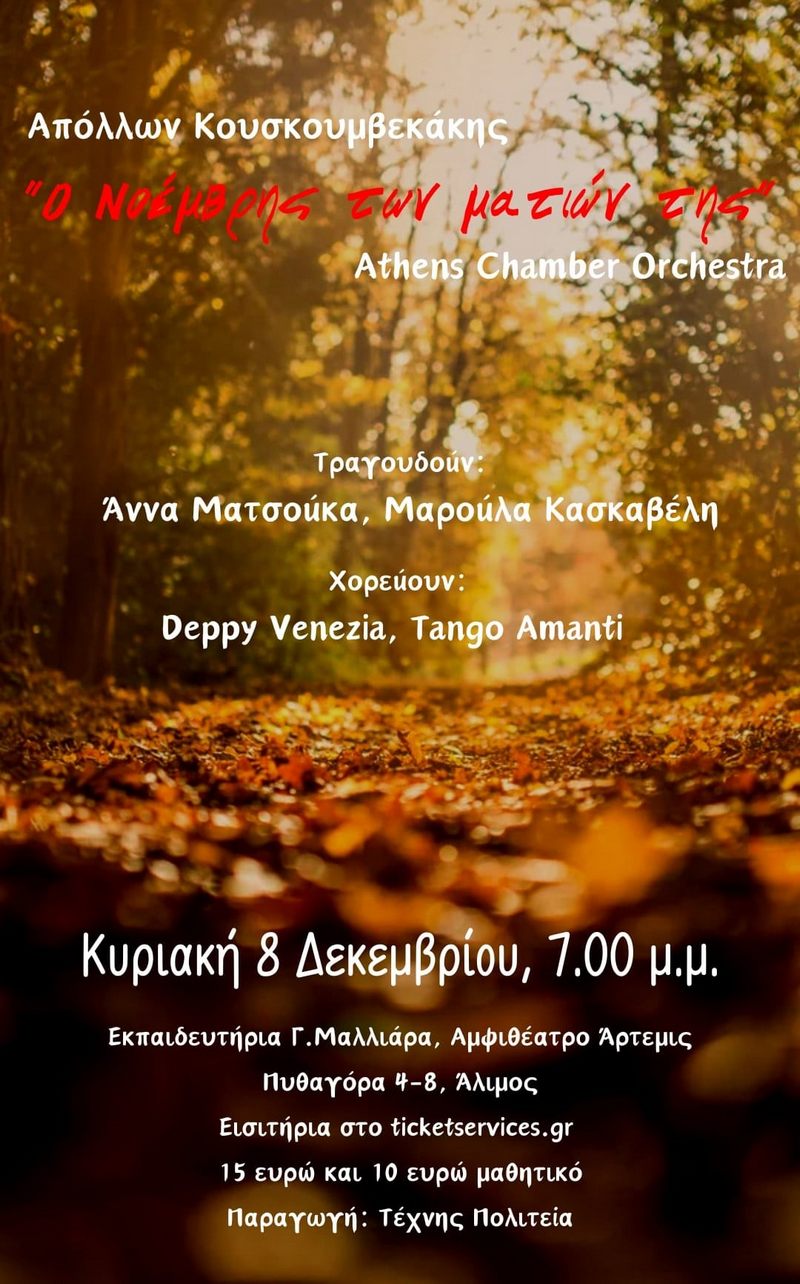 Ο μαέστρος και συνθέτης Απόλλων Κουσκουμβεκάκης παρουσιάζει τη μουσική του, ορχηστρικά θέματα και τραγούδια από τους δίσκους “Ο Νοέμβρης των ματιών της”, “Μ'ένα νεύμα του φιλιού”, Αλατοπίπερο”, “Θα'θελα” και “Music for movies”.