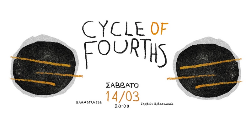 Η ομάδα Athens Arts Collective σας προσκαλεί στο Cycle of 4ths, ένα live εγχείρημα και ταυτόχρονα μία κίνηση συλλογικότητας, με τη συμμετοχή μουσικών της avant-garde πειραματικής σκηνής της Αθήνας. Τέσσερα μουσικά acts πηγαίνουν σε τέσσερις διαφορετικούς χώρους της Αθήνας με μουσική που αλλάζει και διαμορφώνεται ανάλογα με το venue, την ακουστική, το vibe της βραδιάς.