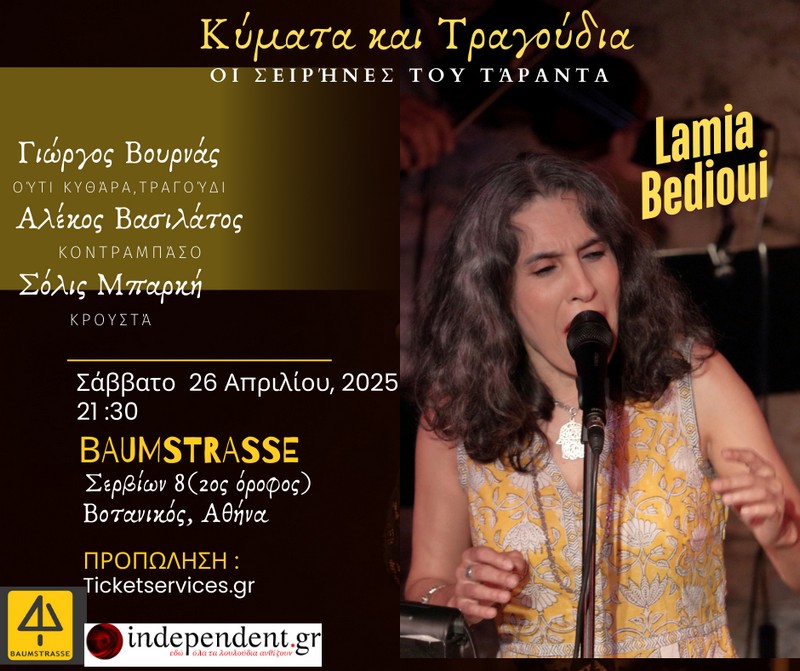 Η Τυνήσια τραγουδίστρια και αφηγήτρια Lamia Bedioui παρουσιάζει «Κύματα και Τραγούδια - Οι Σειρήνες του Τάραντα » στo "Baumstrasse" το Σάββατο 26 Απριλίου 2025 στις 21:30.