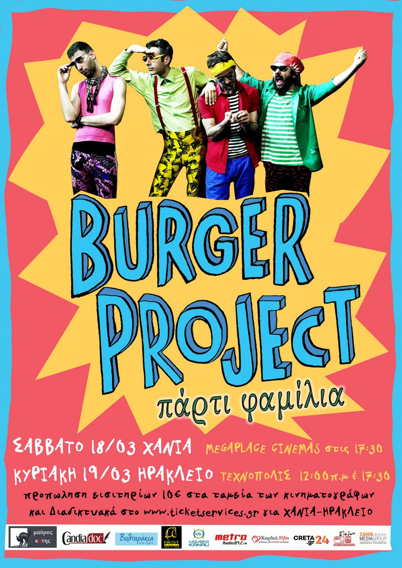 Oι αγαπημένοι μικρών και μεγάλων Burger Project επιστρέφουν σε Χανιά και Ηράκλειο και στήνουν ένα τρελό χορευτικό πάρτι για όλη την οικογένεια, όπου παιδιά, σκυλιά, γατιά, μαμάδες, μπαμπάδες, θείοι και θείες, νονοί, νονές, γιαγιάδες και παππούδες, είναι όλοι ευπρόσδεκτοι ! Στο πρόγραμμα μπαίνουν γνωστές επιτυχίες των Burger, χιούμορ και αυτοσχεδιασμός, διαδραστικά μυστικά παιχνίδια αλλά και απρόσμενα τραγούδια απ' το κινέζικο ρεπερτόριο. Χορευτική και παιχνιδιάρικη διάθεση στα Χανιά το Σάββατο 18 και στο Ηράκλειο Κυριακή 19 Μαρτίου για 3 απίθανες παραστάσεις. Μην το χάσετε !