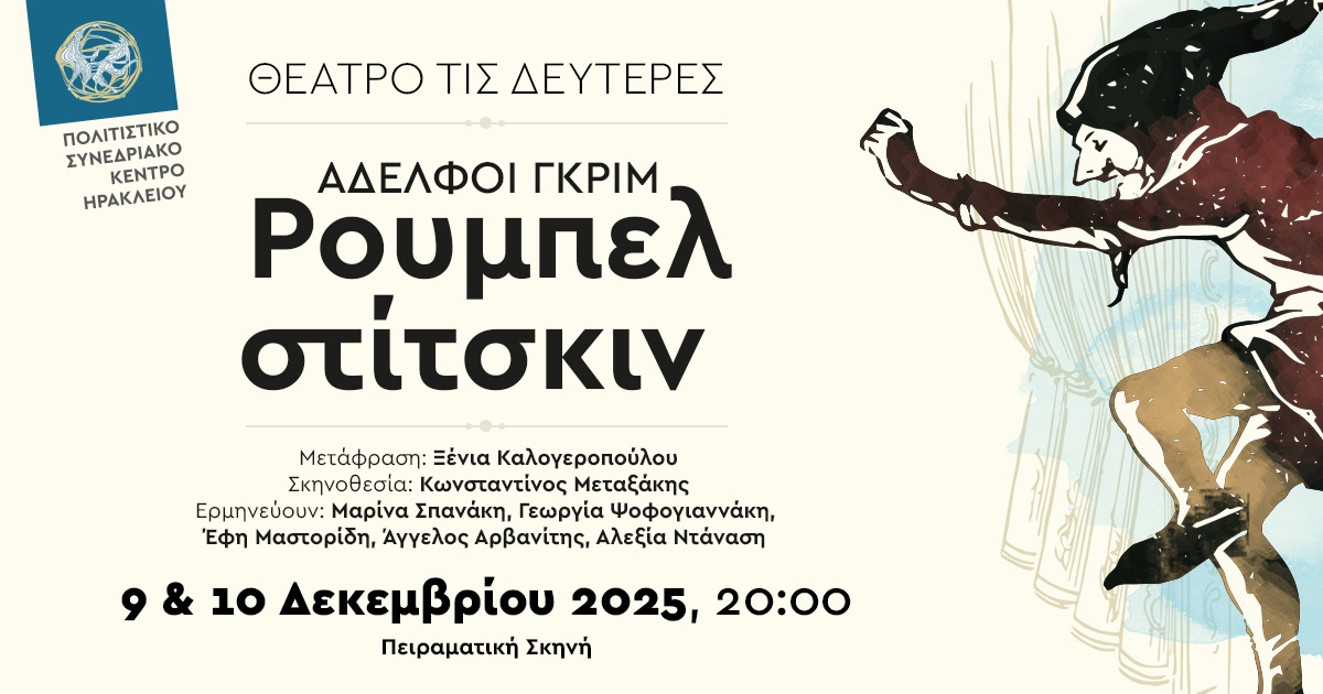 H θεατρική ομάδα Σχήμα 7 παρουσιάζει το σχεδόν 4.000 ετών παραμύθι των αδελφών Γκριμ Ρουμπελστίλτσκιν, σε μετάφραση και προσαρμογή της Ξένιας Καλογεροπούλου, ένα λαογραφικό γερμανικό παραμύθι που συμπεριλαμβάνεται στην έκδοσή τους που χρονολογείται στα 1812, Children’s and Household Tales. Στη γερμανική γλώσσα η λέξη Rumpelstilzchen σημαίνει «μικρή ξυλοπόδαρη κουδουνίστρα», ενώ rumpelstilt ή rumpelstilz στη γερμανική λαογραφία είναι ένα μικρό ξωτικό που κάνει θόρυβο με το ραβδί του ή τις κουδουνίστρες του ταράζοντας την ησυχία των ανθρώπων. Το παραμύθι εξιστορεί τις περιπέτειες ενός όχι και τόσο καλού και αγαθού ξωτικού που φέρνει τα παιδιά αντιμέτωπα με θέματα όπως η αλαζονεία και η υπέρμετρη απληστία, θέτοντας το ερώτημα πότε και πού πρέπει να σταματούν τα θέλω των ανθρώπων. Τη σκηνοθεσία της παράστασης υπογράφει ο Κωνσταντίνος Μεταξάκης.