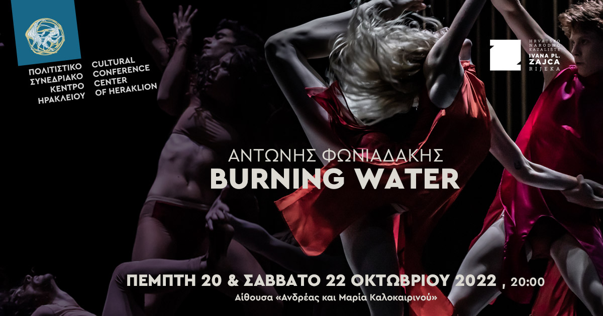 Ο διεθνούς φήμης χορογράφος Αντώνης Φωνιαδάκης στο έργο του Burning Water, που παρουσιάζεται στο ΠΣΚΗ σε συνεργασία με το Μπαλέτο του Κροατικού Εθνικού Θεάτρου της Ριέκα, μετατρέπει σε σωματική κίνηση την ιδέα του νερού, με το χάος και τη γαλήνη να βρίσκονται σε διαρκή αλληλομεταμόρφωση. Περιγράφει το νερό ως οργανικό, φυσικό στοιχείο από την καταιγίδα, με τη διαπεραστική της ενέργεια, ως τον απέραντο ωκεανό, με ό,τι αυτός περιλαμβάνει. Στο έργο, μυθικά πλάσματα και ιστορίες, ναυάγια και ανθρώπινες καταστροφές που οδηγούν σε νέα ένστικτα επιβίωσης, όλα θραύσματα-υλικά, κυλούν ακατάπαυστα χωρίς ποτέ να παίρνουν τελική φόρμα.
