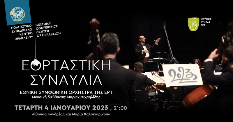 Το εορταστικό κλίμα των Χριστουγέννων και της Πρωτοχρονιάς πλημμυρίζει στο Πολιτιστικό Συνεδριακό Κέντρο Ηρακλείου με μια λαμπερή συναυλία. Το καλωσόρισμα της νέας χρονιάς αναλαμβάνει η Εθνική Συμφωνική Ορχήστρα της ΕΡΤ, υπό τη διεύθυνση του διεθνούς αναγνώρισης αρχιμουσικού Μύρωνα Μιχαηλίδη, και θα γίνει υπό τους ήχους των δημοφιλέστερων κλασικών αριστουργημάτων.