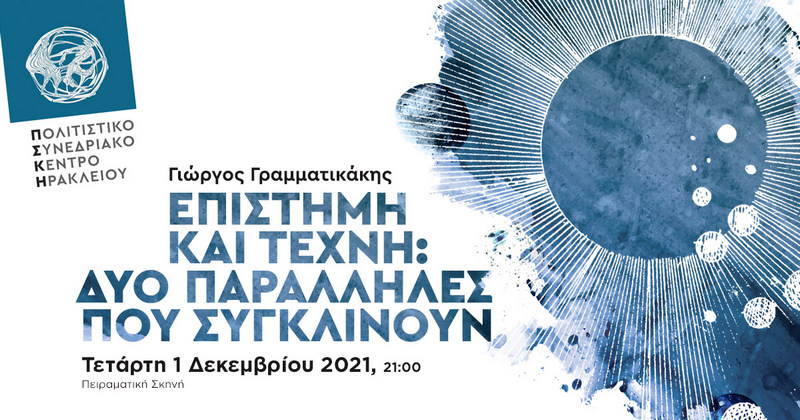 Τη σχέση λοιπόν της επιστήμης με την τέχνη, που παρουσιάζει εξαιρετικό ενδιαφέρον αλλά και αναπάντεχες πλευρές, διερευνά ο Γιώργος Γραμματικάκης, με την ομιλία του Επιστήμη και Τέχνη: δύο παράλληλες που συγκλίνουν, που θα πραγματοποιηθεί την Τετάρτη, 1 Δεκεμβρίου, και ώρα 21:00 μ.μ. στο Πολιτιστικό Συνεδριακό Κέντρο Ηρακλείου (Πειραματική Σκηνή).