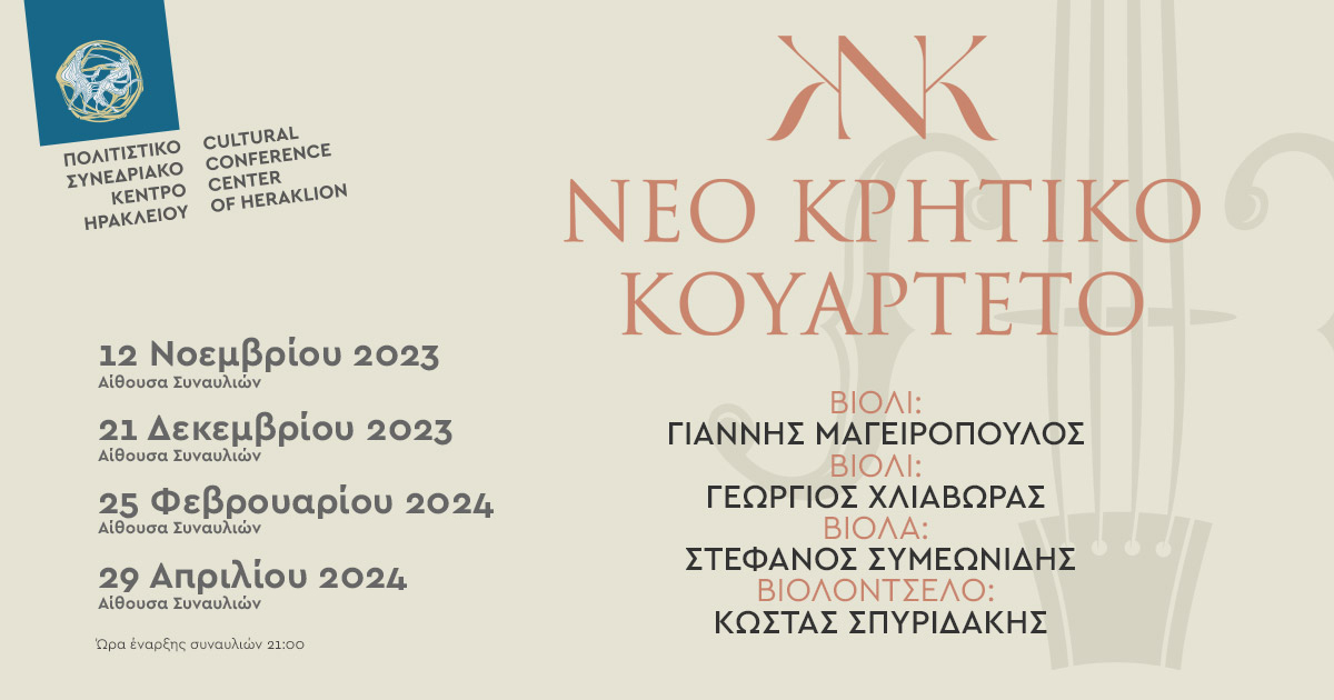 Το Νέο Κρητικό Κουαρτέτο γεννήθηκε το 2018 μέσα από τα σπλάχνα της Συμφωνικής Ορχήστρας Νέων Δήμου Ηρακλείου υπό την επίβλεψη και καθοδήγηση του βιολιστή Γιώργου Δεμερτζή. Το όνομά του αποτελεί αναφορά στο Κρητικό Κουαρτέτο του Αριστείδη Αντωνακάκη, το οποίο δραστηριοποιήθηκε στο Ηράκλειο Κρήτης κατά τις αρχές προς τα μέσα του 20ου αιώνα.