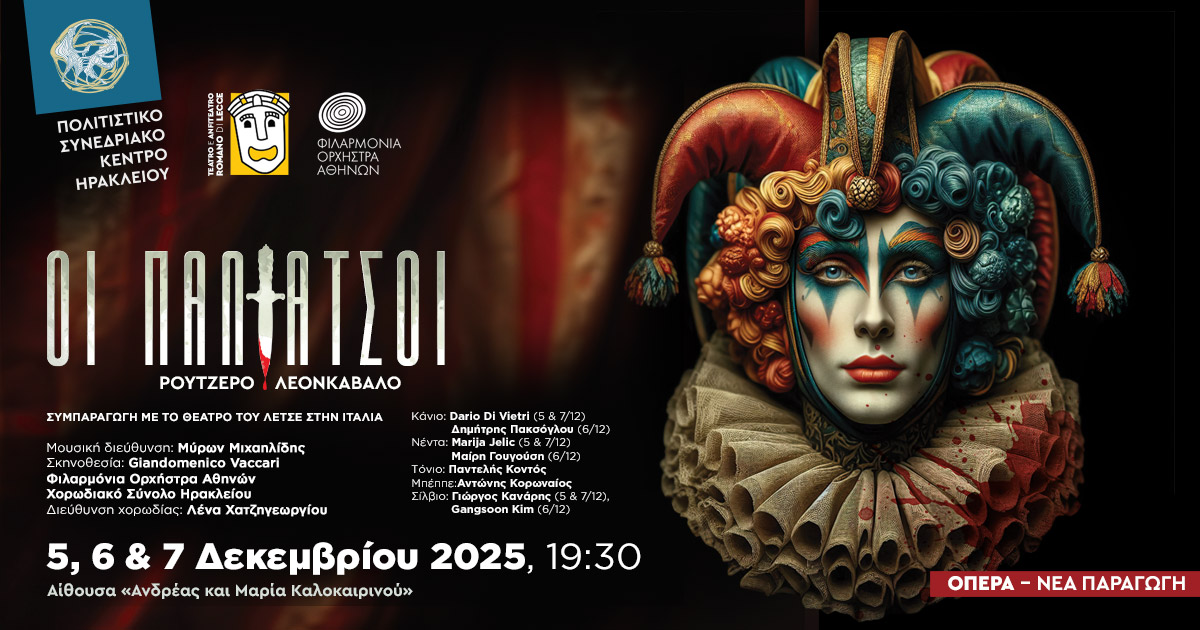Οι διάσημοι Παλιάτσοι, η εμβληματική μονόπρακτη όπερα του Ρουτζέρο Λεονκαβάλλο, ανεβαίνει στη σκηνή του ΠΣΚΗ για τρεις παραστάσεις, σε συνεργασία με την Provincia di Lecce και το Politeama Greco Theatre της Ιταλίας. Καταξιωμένοι λυρικοί καλλιτέχνες, η Φιλαρμόνια Ορχήστρα Αθηνών και το Χορωδιακό Σύνολο Ηρακλείου ζωντανεύουν επί σκηνής ένα κορυφαίο δείγμα του Βερισμού σε σκηνοθεσία του διακεκριμένου Giandomenico Vaccari, υπό τη μπαγκέτα του διεθνούς φήμης αρχιμουσικού Μύρωνα Μιχαηλίδη.