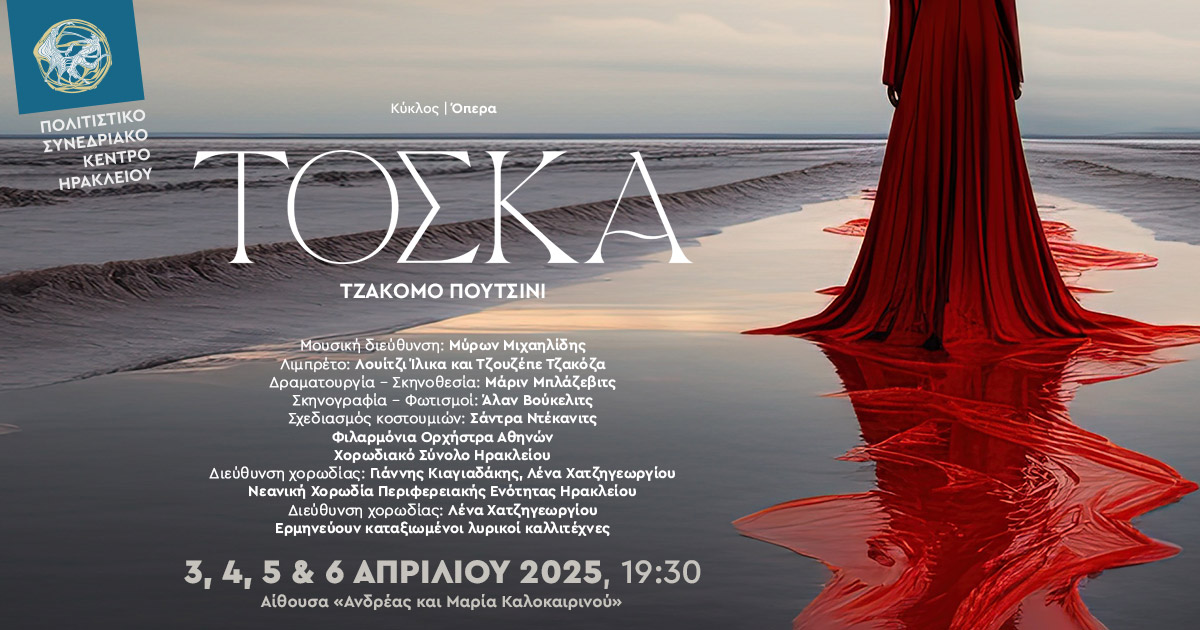 Σε συνεργασία με το Εθνικό Κροατικό Θέατρο της Ριέκα ανεβαίνει τον Απρίλιο στη σκηνή του ΠΣΚΗ και για τέσσερις παραστάσεις η Τόσκα του Τζάκομο Πουτσίνι, μία από τις κορυφαίες και δημοφιλέστερες όπερες του διεθνούς ρεπερτορίου, υπό τη σκηνοθετική ματιά του Μάριν Μπλάζεβιτς, οι καταξιωμένοι λυρικοί καλλιτέχνες, η Φιλαρμόνια Ορχήστρα Αθηνών, το Χορωδιακό Σύνολο Ηρακλείου και η Παιδική και Νεανική Χορωδία Περιφερειακής Ενότητας Ηρακλείου.