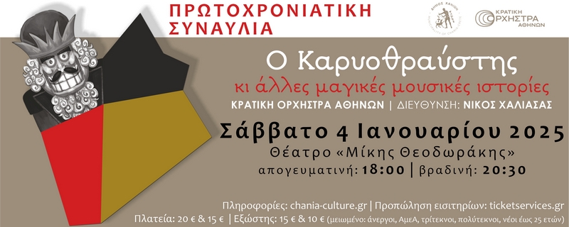 Ο Δήμος Χανίων καλωσορίζει το νέο έτος και παρουσιάζει την Κρατική Ορχήστρα Αθηνών σε μια πρωτοχρονιάτικη συναυλία με μερικές από τις πιο αγαπημένες μουσικές ιστορίες όλων των εποχών.