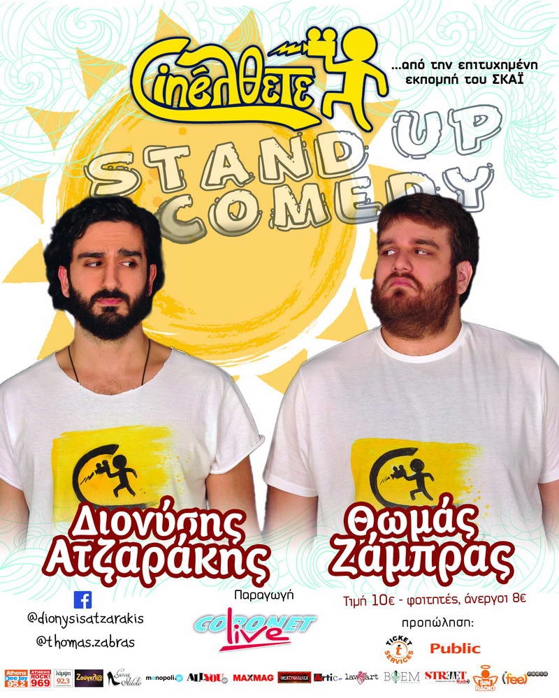 Ο Διονύσης Ατζαράκης και ο Θωμάς Ζάμπρας, μετά την τηλεοπτική επιτυχία στο ΣΚΑΙ και sold out παραστάσεις, παρουσιάζουν την stand up comedy «Cineλθετε» σε όλα τα μεγάλα φεστιβάλ της Ελλάδας. Σε δυο ώρες ασταμάτητου γέλιου, μιλούν για την καθημερινότητα, τις σχέσεις, την Αλίκη Βουγιουκλάκη, τα Τρίκαλα, τα σχολικά τους χρόνια, το facebook, τα ψυχολογικά τους, τον Μπάτμαν και τις πρώην τους. Αν έχετε και εσείς θέματα με την ποιότητα του τηλεοπτικού και κινηματογραφικού τοπίου στις ημέρες μας, ή απλά θέματα με την πρώην σας, η παράσταση «Cineλθετε» είναι ιδανική για εσάς. Μην τους χάσετε