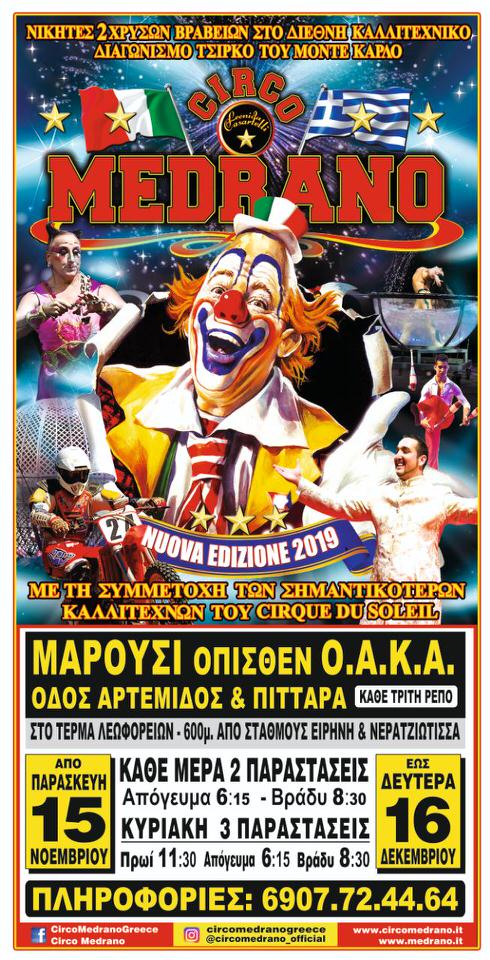 Το διάσημο Ιταλικό CIRCO MEDRANO το τσίρκο των πιο όμορφων αναμνήσεών μας μετά την νέα επιτυχημένη περιοδεία του στην Ελλάδα με κομβικό σταθμό την παρουσία του στην 84η Διεθνή Έκθεση Θεσσαλονίκης, έφτασε τώρα και στην Αθήνα, στο Μαρούσι όπισθεν Ο.Α.Κ.Α επι των οδών Πιτταρά & Αρτέμιδος στο Τέρμα Λεωφορείων 600μ από σταθμούς ΕΙΡΗΝΗ & ΝΕΡΑΤΖΙΩΤΙΣΣΑ – ΑΠΟ ΠΑΡΑΣΚΕΥΗ 15 ΝΟΕΜΒΡΙΟΥ ΜΕΧΡΙ ΔΕΥΤΕΡΑ 16 ΔΕΚΕΜΒΡΙΟΥ 2019 – με 2 καθημερινές παραστάσεις στις 18:15 και 20:30 – εκτός Τρίτης που υπάρχει ρεπό – και την Κυριακή με 3 παραστάσεις στις 11:30, 18:15 και 20:30.