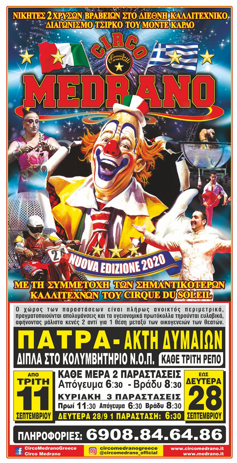 Το διάσημο CIRCO MEDRANO το τσίρκο των πιο όμορφων αναμνήσεών μας συνεχίζει αδιάλειπτα την περιοδεία του στην Ελλάδα με κομβικό σταθμό την παρουσία του στην 84η (Σεπτέμβρης 2019) Διεθνή Έκθεση Θεσσαλονίκης, την Αθήνα κατά το χειμώνα 2019-2020, και την σταθερή παραμονή του καθ'όλη την διάρκεια της καραντίνας στην Ελλάδα, επανεκκινεί τις παραστάσεις του στην Πάτρα από την Παρασκευη 11 μέχρι και την Δευτέρα 28 Σεπτεμβρίου, επι της Ακτής Δυμαίων, δίπλα στο κολυμβητήριο του Ν.Ο.Π., με 2 καθημερινές παραστάσεις στις 18:30 και 20:30 - εκτός Δευτέρας που θα γίνει μόνο η παράσταση στις 18:30.