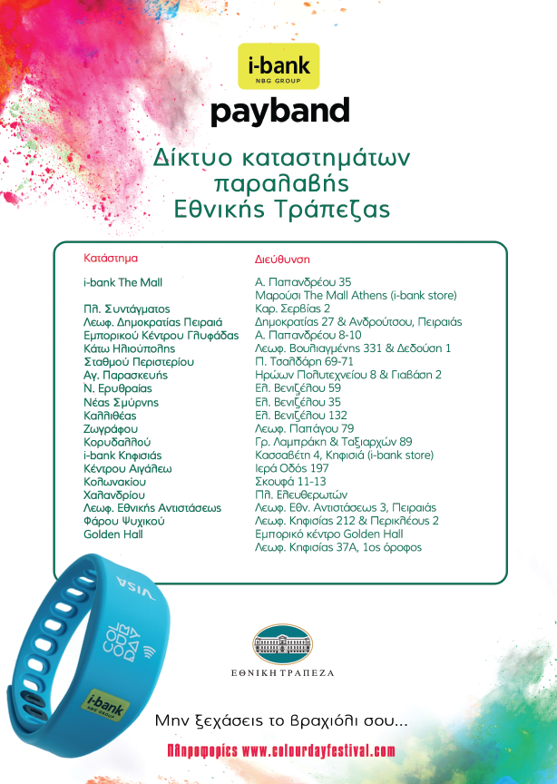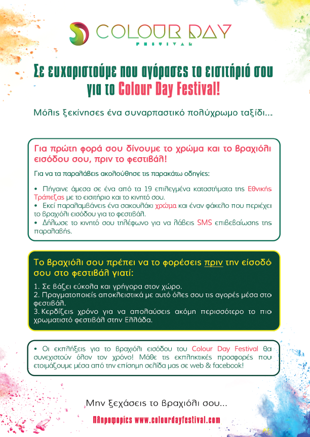 Με το εισιτήριο σου αγοράζεις την συμμετοχή σου στο Colour Day Festival. Για να μπεις μέσα στον χώρο του φεστιβάλ και να παραλάβεις το χρώμα και το βραχιόλι εισόδου σου, θα πρέπει ΥΠΟΧΡΕΩΤΙΚΑ μαζί με το εισιτήριο και το κινητό σου να επισκεφτείς ένα από τα 19 καταστήματα της Εθνικής Τράπεζας όπου σε ειδικά διαμορφωμένους χώρους θα παραλάβεις: