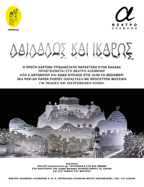Η ομάδα «Αφού» παρουσιάζει την πρώτη χάρτινη τρισδιάστατη παράσταση στην Ελλάδα «Δαίδαλος και Ίκαρος» στο θέατρο Αλκμήνη από 2 Οκτωβρίου 2022 και κάθε Κυριακή στις 12 το μεσημέρι για όλη την οικογένεια και καθημερινές για σχολεία. «Ο Δαίδαλος και Ίκαρος», η πρώτη pop up paper puppet παράσταση, που παρουσιάστηκε με επιτυχία στο πρόγραμμα «Όλη η Ελλάδα Ένας Πολιτισμός» 2021 του Υπουργείου Πολιτισμού, παντρεύει αριστοτεχνικά την τέχνη του θεάτρου, της εμψύχωσης, του κουκλοθεάτρου, των εικαστικών, της αφήγησης και της μουσικής.
