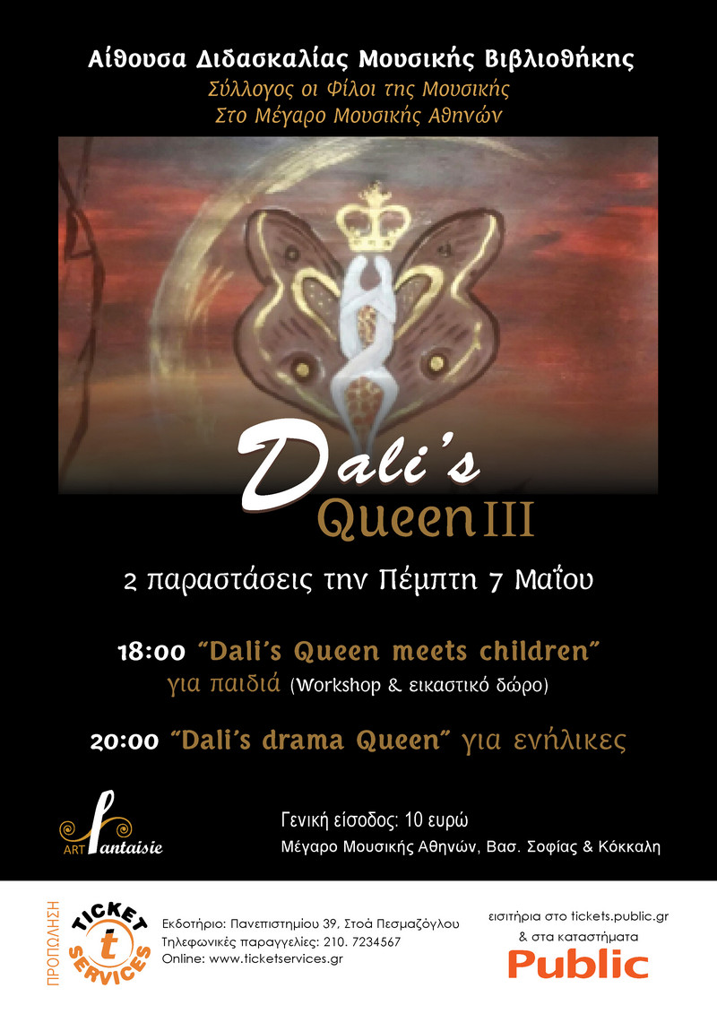 Η "Αrt Fantaisie" παρουσιάζει την εκδήλωση «Dali's Queen ΙΙΙ» (χορός-κίνηση/θέατρο/projection/εικαστικά/μουσική), που θα πραγματοποιηθεί στη Μουσική Βιβλιοθήκη του Συλλόγου Οι Φίλοι της Μουσικής στο Μέγαρο Μουσικής Αθηνών στις 12 Μαρτίου και απαρτίζεται από δύο παραστάσεις: