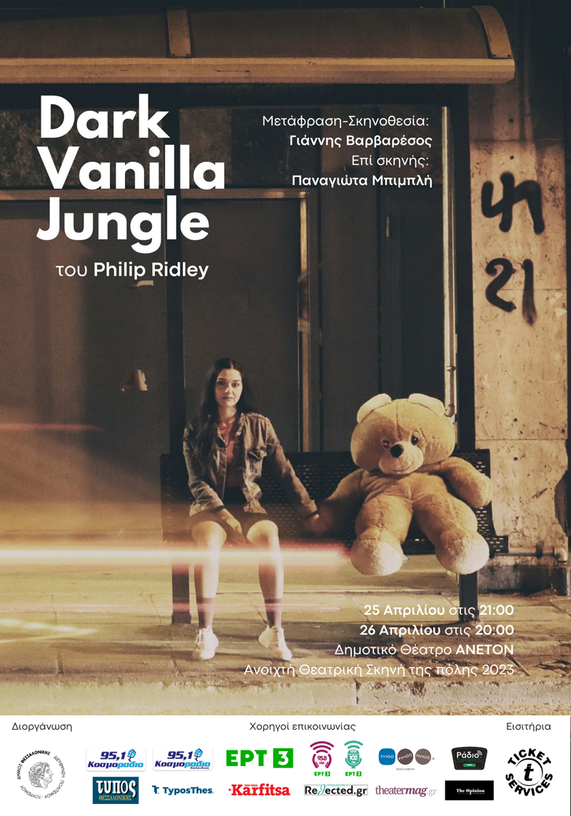 Μετά από μια επιτυχημένη πορεία, η οποία συνεχίζεται, στο Θέατρο Φούρνος στην Αθήνα, το έργο του βραβευμένου Βρετανού συγγραφέα Philip Ridley, Dark Vanilla Jungle σε σκηνοθεσία Γιάννη Βαρβαρέσου, έρχεται για δύο παραστάσεις στις 25 και 26 Απριλίου στο Δημοτικό Θέατρο Άνετον, στο πλαίσιο της Ανοιχτής Θεατρικής Σκηνής της πόλης 2023 που διοργανώνει η Διεύθυνση Πολιτισμού του Δήμου Θεσσαλονίκης. Το Dark Vanilla Jungle είναι ένας καθηλωτικός γυναικείος μονόλογος που φέρνει στο προσκήνιο την κακοποίηση και τη βία που δέχεται ένα κορίτσι από το περιβάλλον του, οδηγώντας το σε οριακές καταστάσεις όπου το όνειρο γλιστρά στη σκληρότητα της πραγματικότητας.