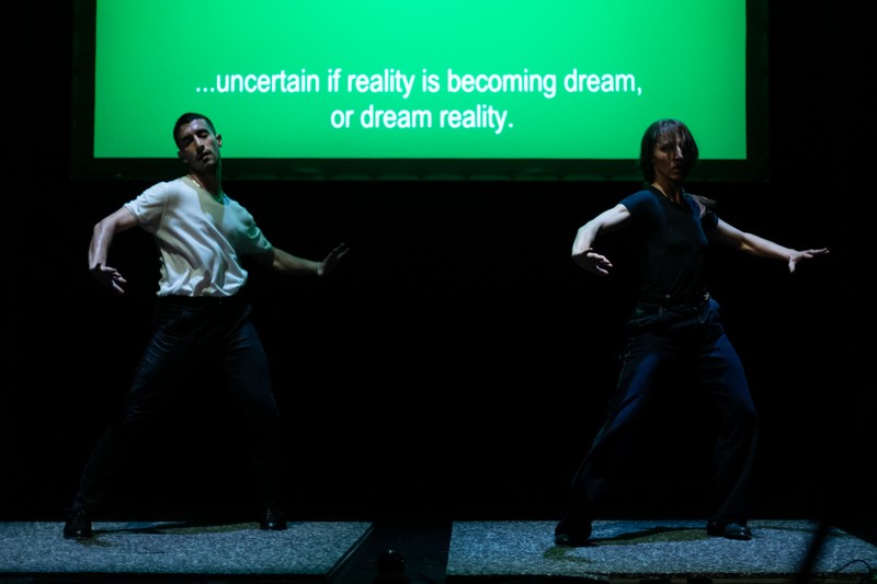 Δύο περφόρμερ συνδιαλέγονται με εικόνες ασύνδετες μεταξύ τους και επιχειρούν να προσδώσουν τη δική τους καταγραφή στον χώρο. Το σώμα και η (μικρο)κίνηση συνυπάρχουν με παράδοξα αντικείμενα και υλικά, λειτουργώντας ως μέσα παραγωγής ήχου. Εντάσεις, εκρήξεις, παύσεις, επαναλήψεις και παραμορφώσεις του υλικού ενισχύουν την ηχητική εμπειρία.