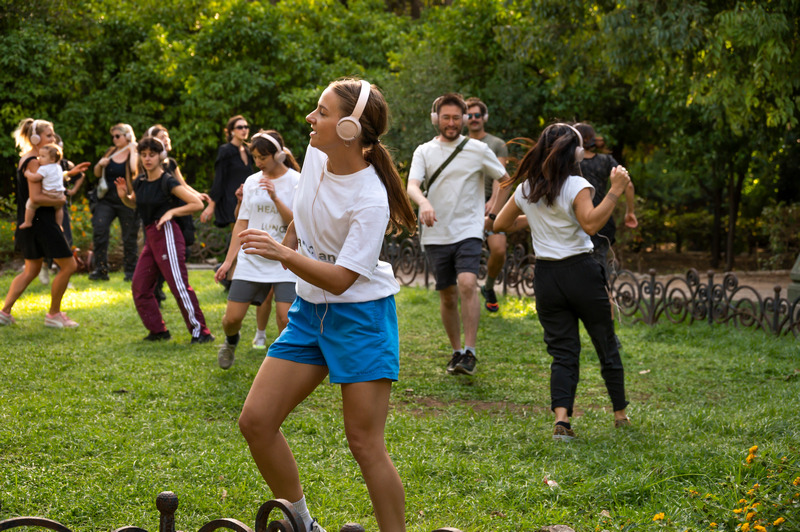 Το Dance Your Way Out είναι μια ακουστική - περιπατητική εμπειρία, μια καθοδηγούμενη διαδρομή για τη χαρά της κίνησης και την απόλαυση του ελεύθερου χορού. Οι συμμετέχοντες συναντούν τους ''οδηγούς'' τους, και τους ακολουθούν κατά μήκος μιας διαδρομής στο δημόσιο χώρο, σερφάροντας ανάμεσα σε αφηγηματικές φωνές και πρακτικές σωματικές οδηγίες. Το έργο αντλεί από την ιδέα της ''χορευτικής πανούκλας'' (dancing plague, choreomania) και της μεταδοτικότητας του χορού - ένα κοινωνικό φαινόμενο που εμφανίστηκε στα τέλη του Μεσαίωνα, παρασύροντας τους ανθρώπους σε έναν ατέρμονο χορό για μέρες - και βασίζεται στην ψυχαγωγία και την ικανότητα του ανθρώπινου σώματος να 'ακούει' το ρυθμό. Προτείνει μια συλλογική εμπειρία και μια πρόσκληση, προς έναν tekno χορό μέσα στο δημόσιο χώρο. Πώς βιώνουμε την καθημερινή μας διαδρομή στην πόλη, μέσα από τον ήχο και την κίνηση? Οι συμμετέχοντες πλοηγούνται σαν μια ομάδα που ακολουθεί το δικό της ρυθμό, ανάμεσα στις διαφορετικές χρονικότητες που προτείνει το τοπίο. Το Dance Your Way Out είναι μια ζωντανή και ηχηρή εμπειρία για τους συμμετέχοντες, ενώ παραμένει σιωπηλή για τους παρατηρητές!