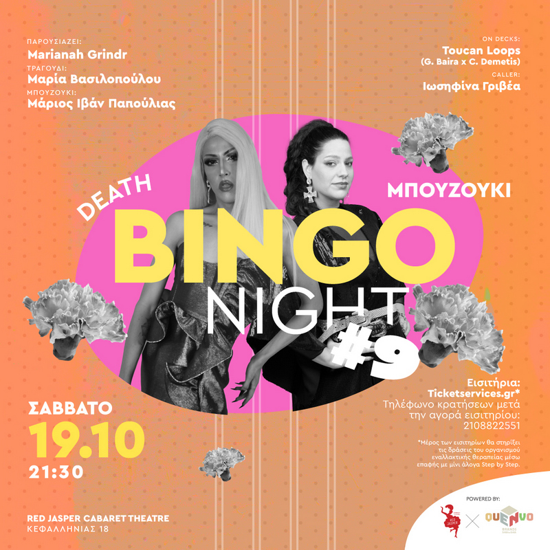Το Red Jasper Cabaret Theatre, που πραγματοποιεί τα τελευταία χρόνια μία σειρά από εναλλακτικές βραδιές Bingo στην Αθήνα και φιλοξενεί στη σκηνή του τα πιο δημιουργικά κύτταρά της και το Creative Boutique Agency QUENVO, που έχει ξεχωρίσει για τα δημιουργικά του πρότζεκτ εντός και εκτός συνόρων, σας προσκαλούν το Σάββατο 19/10 στις 21:30 σε μία βραδιά Death Bingo αφιερωμένη στα μπουζούκια.