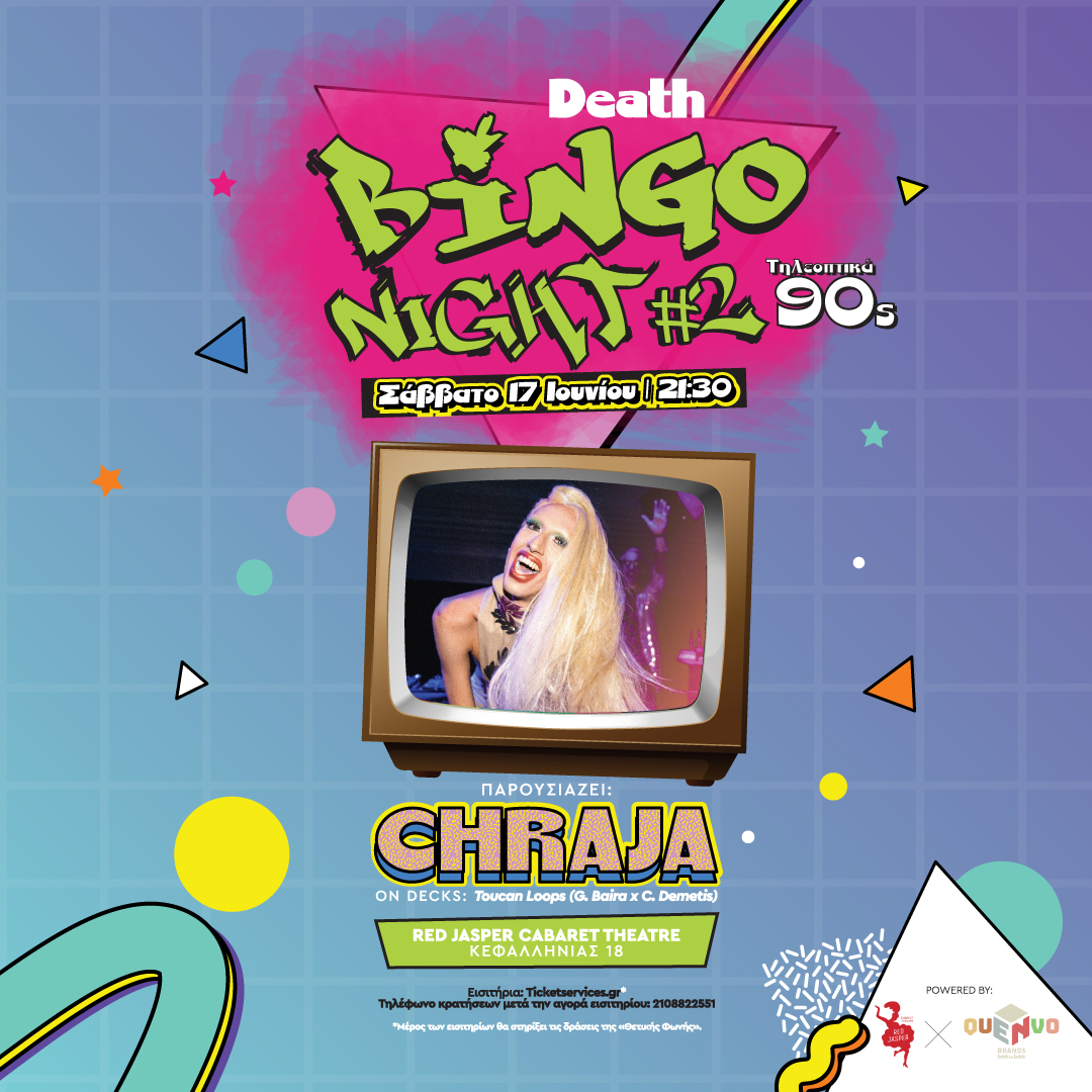 Το Red Jasper Cabaret Theatre, που πραγματοποίησε φέτος μία σειρά από εναλλακτικές βραδιές Bingo στην Αθήνα και φιλοξενεί στη σκηνή του τα πιο δημιουργικά κύτταρά της και το Creative Boutique Agency QUENVO, που έχει ξεχωρίσει για τα δημιουργικά του πρότζεκτ εντός και εκτός συνόρων, σας προσκαλούν το Σάββατο 17/6 στις 21:30 σε μία βραδιά Death Bingo αφιερωμένη στα τηλεοπτικά 90s με παρουσιάστρια την CHRAZA.