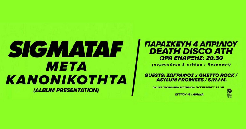 Ο Sigmataf, ένας από τους πιο πρωτοποριακούς εκπροσώπους της ελληνικής σκηνής, επιστρέφει δυναμικά στην Αθήνα για μια μοναδική συναυλία στις 4 Απριλίου 2025. Η εμφάνιση αυτή σηματοδοτεί την επίσημη παρουσίαση του νέου του δίσκου "ΜETAKANONIKOTHTA", που κυκλοφόρησε τον Νοέμβριο του 2024 και έχει ήδη αφήσει το αποτύπωμά του στη σύγχρονη μουσική σκηνή.