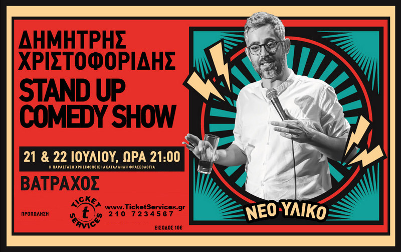 2 βραδιές όρθιας κωμωδίας με το καινούργιο του υλικό και σας προσκαλούμε όλους να έρθετε για γέλιο και κοκτειλάρες στην βατραχοταράτσα. Κλείστε λοιπόν εισιτήρια για την παράσταση του Δημήτρη στο ticketservices.gr για τα 2 stand up comedy show, στις