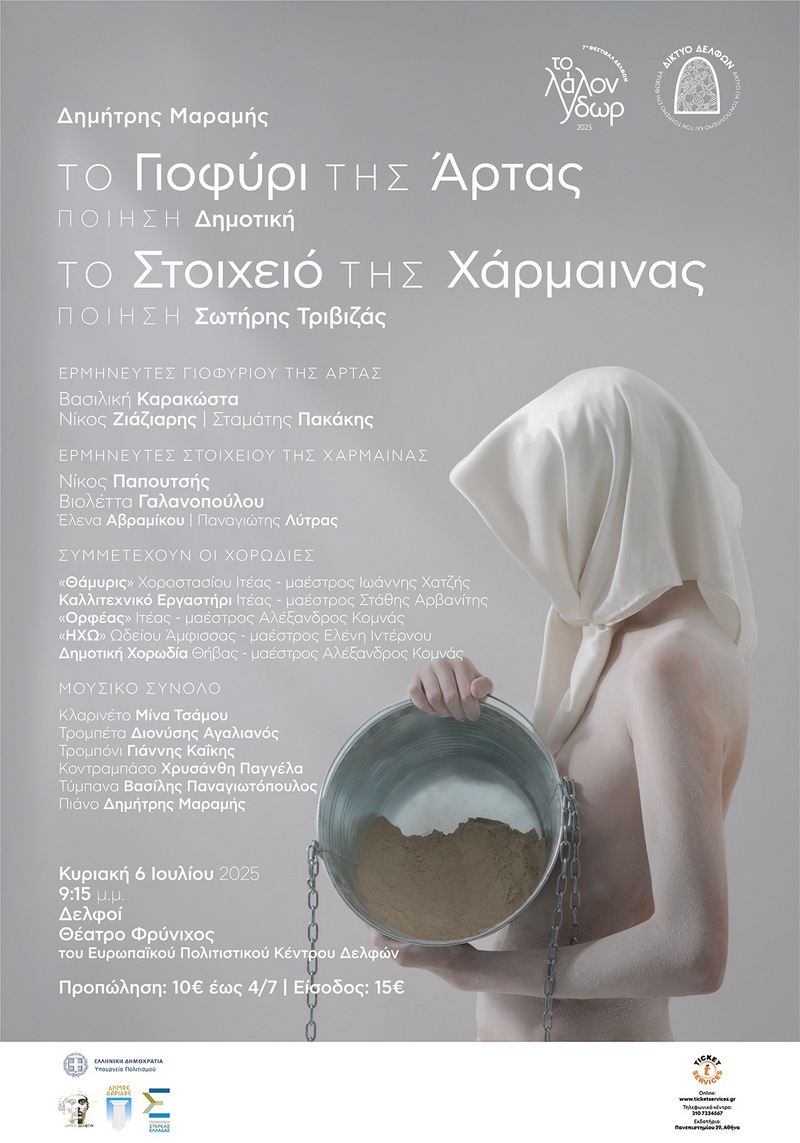 Το Φεστιβάλ Δελφών «To Λάλον Ύδωρ» παρουσιάζει την Κυριακή 6 Ιουλίου δύο μουσικοθεατρικά έργα του συνθέτη Δημήτρη Μαραμή: το «Το Γιοφύρι της Άρτας» βασισμένο στο αριστουργηματικό, δημοτικό μας τραγούδι και το «Το Στοιχειό της Χάρμαινας» σε ποίηση Σωτήρη Τριβιζά, παντρεύοντας τη σύγχρονη μουσική έκφραση με τη λαϊκή μας παράδοση. Το «Στοιχειό της Χάρμαινας» βασίζεται σε θρύλους της Άμφισσας και στο ομώνυμο παραμύθι της Μάντυς Δασκαλοπούλου