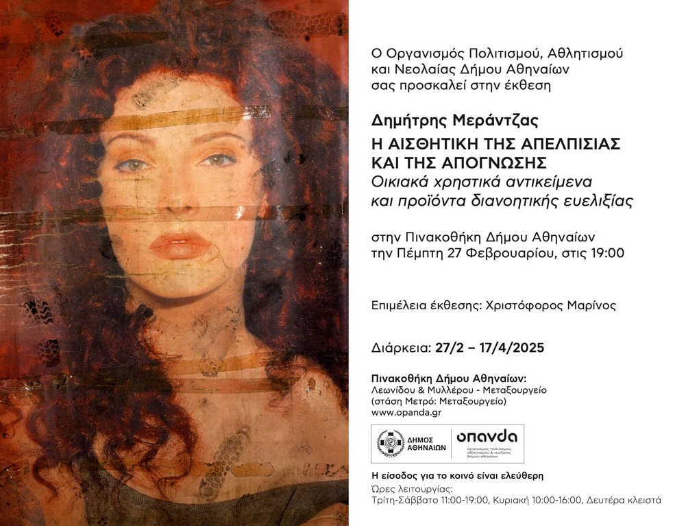 Ο Δήμος Αθηναίων, μέσω του Οργανισμού Πολιτισμού, Αθλητισμού και Νεολαίας Δήμου Αθηναίων (ΟΠΑΝΔΑ), παρουσιάζει, από τις 27 Φεβρουαρίου έως τις 17 Απριλίου 2025 στην Πινακοθήκη Δήμου Αθηναίων την έκθεση του Δημήτρη Μεράντζα με τίτλο «Η αισθητική της απελπισίας και της απόγνωσης: Οικιακά χρηστικά αντικείμενα και προϊόντα διανοητικής ευελιξίας», η οποία αποτελεί ένα ιδιαίτερο εγχείρημα, καθώς συνδυάζοντας τη γλυπτική με το ντιζάιν, τα έργα διαπνέονται από τη φιλοσοφία του «φτιάξτο μόνος σου» (DIY), προωθώντας την ιδέα του έργου τέχνης ως χρηστικού αντικειμένου.
