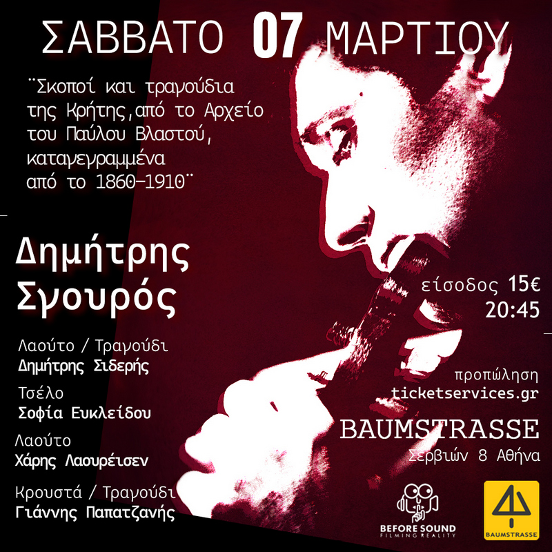 Με αφορμή λοιπόν το διήμερο σεμινάριο κρητικής λύρας, που είναι αφιερωμένο στις μουσικές καταγραφές κρητικών τραγουδιών που πραγματοποίησε ο Π. Βλαστός τον 19ο αιώνα, ο Δημήτρης Σγουρός με τους εξαιρετικούς συνεργάτες του, θα μας παρουσιάσει μια συναυλία με επιλεγμένα τραγούδια από τις καταγραφές αυτές του Παύλου Βλαστού, και πάλι στο φιλόξενο χώρο του «Baumstrasse», το Σάββατο 07 Μαρτίου 2026.