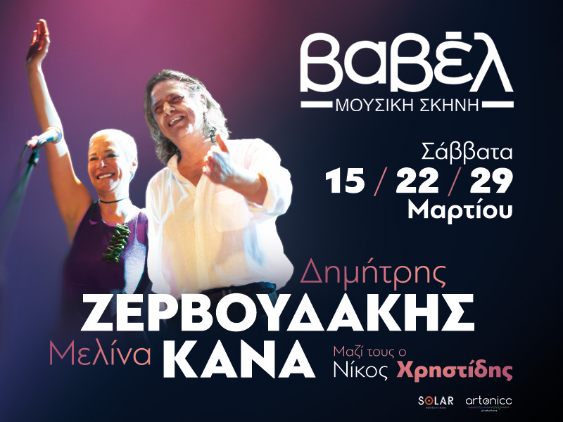 Ο Δημήτρης Ζερβουδάκης και η Μελίνα Κανά επιστρέφουν στην Αθήνα για τρεις μαγικές βραδιές στη νέα μουσική σκηνή «ΒΑΒΕΛ» τα Σάββατα 15, 22, 29 Μαρτίου!