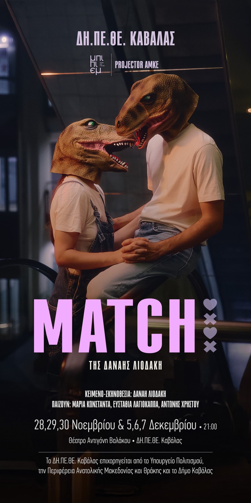 Το ΔΗΠΕΘΕ Καβάλας παρουσιάζει σε πανελλήνια πρώτη, το νέο θεατρικό έργο της Δανάης Λιοδάκη «Match» την Πέμπτη 28, την Παρασκευή 29, το Σάββατο 30 Νοεμβρίου και την Πέμπτη 5, την Παρασκευή 6 και το Σάββατο 7 Δεκεμβρίου 2024 στις 9 το βράδυ στο θέατρο Αντιγόνη Βαλάκου.