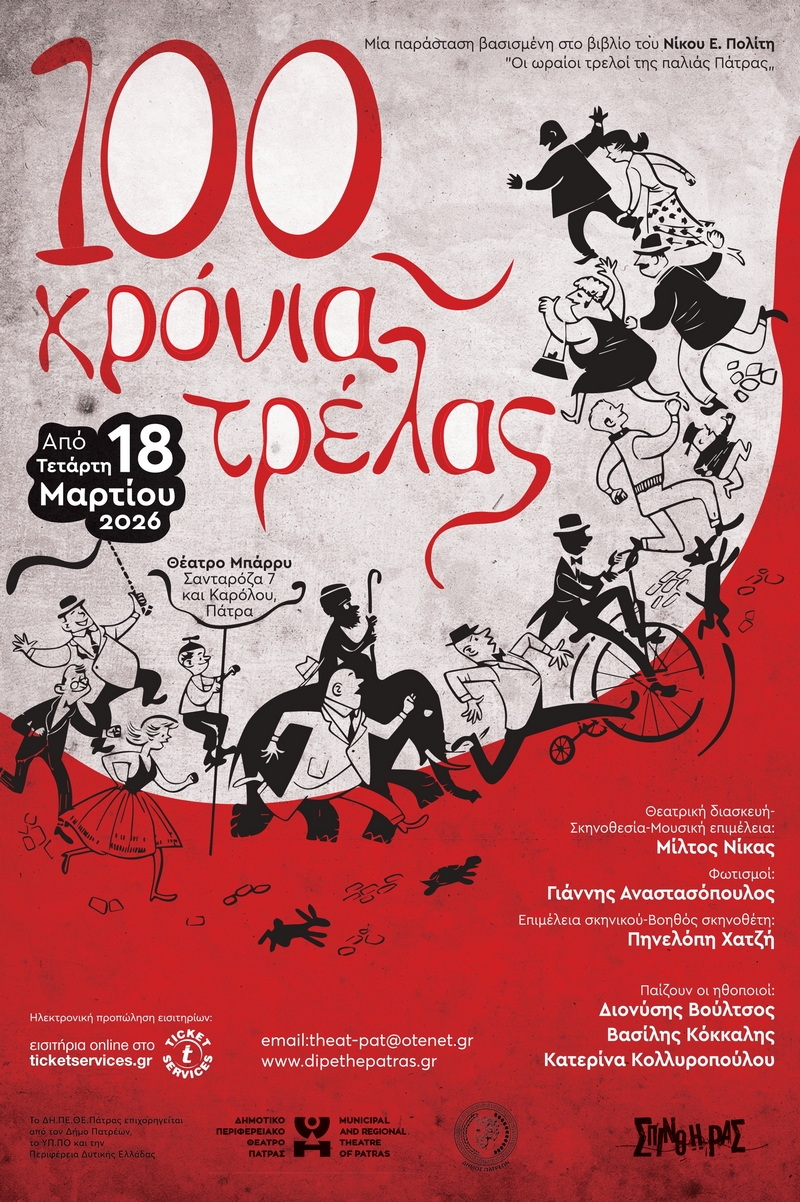 Το ΔΗ.ΠΕ.ΘΕ. Πάτρας και η Αστική μη κερδοσκοπική εταιρεία Σπινθήρας παρουσιάζουν την θεατρική παράσταση 100 χρόνια τρέλας σε σκηνοθεσία Μίλτου Νίκα, βασισμένη στο βιβλίο του Νίκου Ε. Πολίτη «Οι ωραίοι τρελοί της Πάτρας».