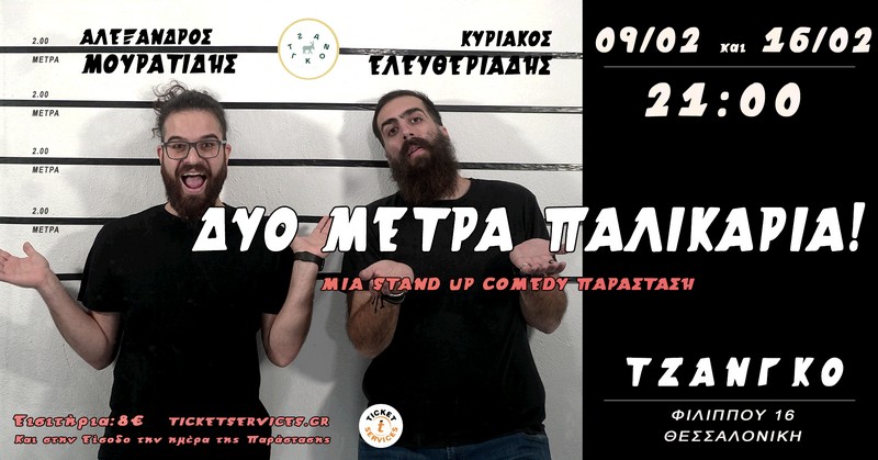 "ΔΥΟ ΜΕΤΡΑ ΠΑΛΙΚΑΡΙΑ", μια stand up comedy παράσταση από τον Κυριάκο Ελευθεριάδη και τον Αλέξανδρο Μουρατίδη, η οποία έχει σφυρηλατηθεί στα έγκατα της ελληνικής επαρχίας!