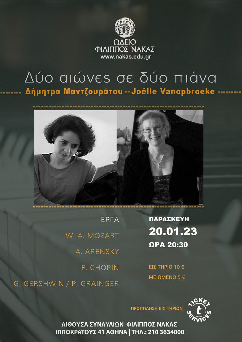 Μία σονάτα, μία σουίτα, ένα ροντό και μία φαντασία έρχονται να διαγράψουν την πορεία του ρεπερτορίου για δύο πιάνα σε χρονικό εύρος δύο αιώνων, με ερμηνεύτριες τις Δήμητρα Μαντζουράτου και Joëlle Vanopbroeke.