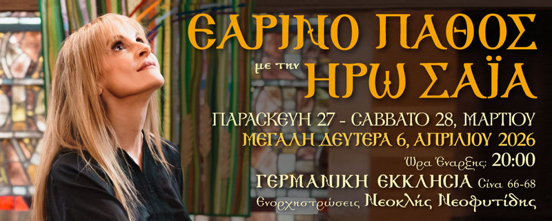 Tην Παρασκευή 27, το Σάββατο 28 Μαρτίου και την Τετάρτη 1η Απριλίου στον μικρό και κατανυκτικό χώρο της Γερμανικής Εκκλησίας Αθηνών (Σίνα 66-68), η Ηρώ Σαΐα «παντρεύει» τον πόνο του Θείου Πάθους με τη γιορτή της φύσης, την Άνοιξη.