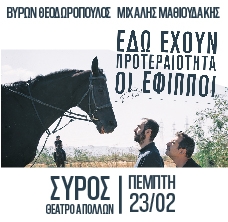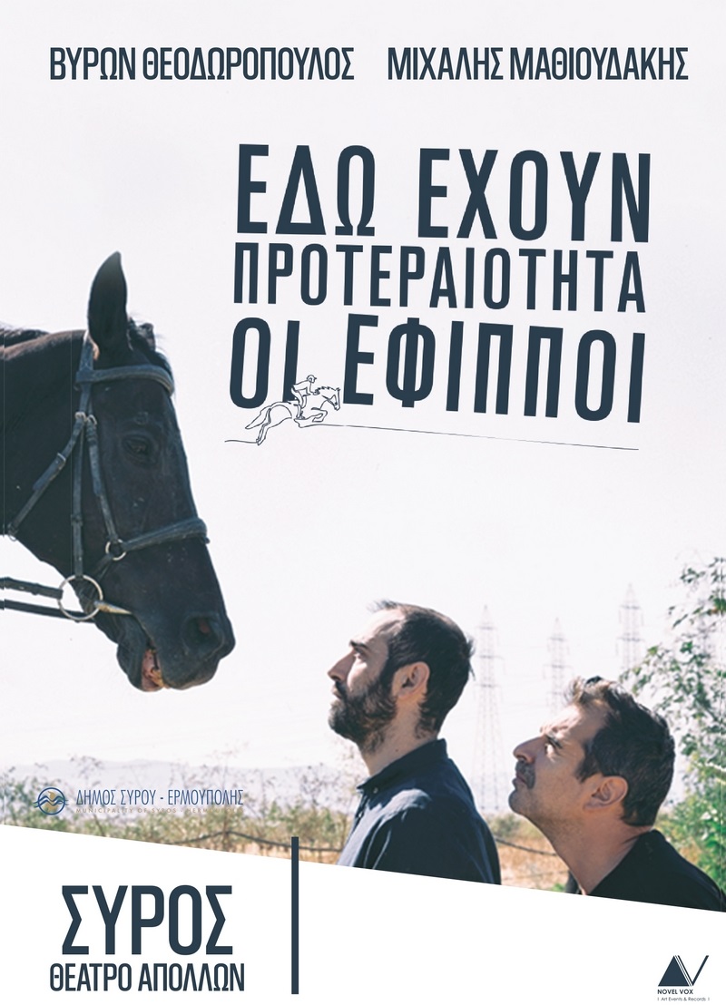 Η stand up comedy παράσταση με τίτλο «Εδώ έχουν προτεραιότητα οι έφιπποι» είναι η καινούρια δουλειά του Βύρωνα Θεοδωρόπουλου και του Μιχάλη Μαθιουδάκη.
