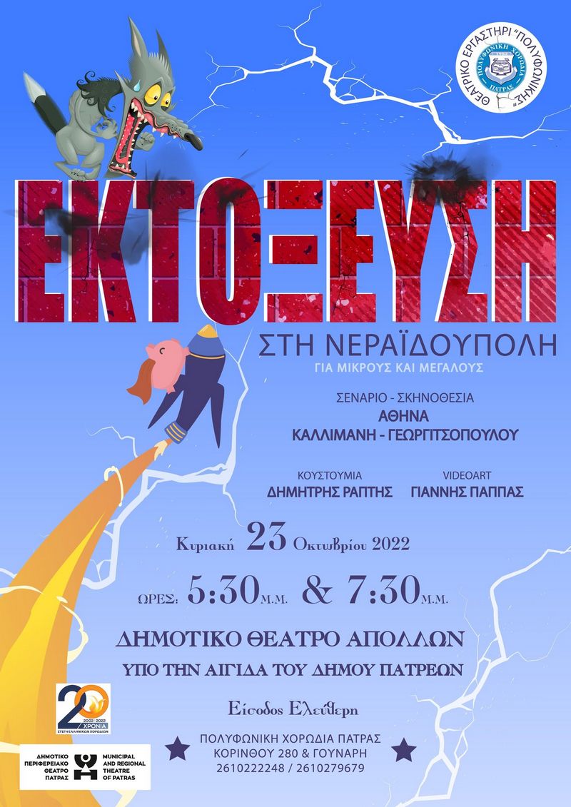 Το ΘΕΑΤΡΙΚΟ ΕΡΓΑΣΤΗΡΙ της ΠΟΛΥΦΩΝΙΚΗΣ ΧΟΡΩΔΙΑΣ ΠΑΤΡΑΣ- τμήμα ενηλίκων, παρουσιάζει την παράσταση: ΕΚΤΟΞΕΥΣΗ ΣΤΗ ΝΕΡΑΪΔΟΥΠΟΛΗ την Κυριακή 23 Οκτωβρίου 2022 στις 5:30 μ.μ. και στις 7:30 μ.μ.