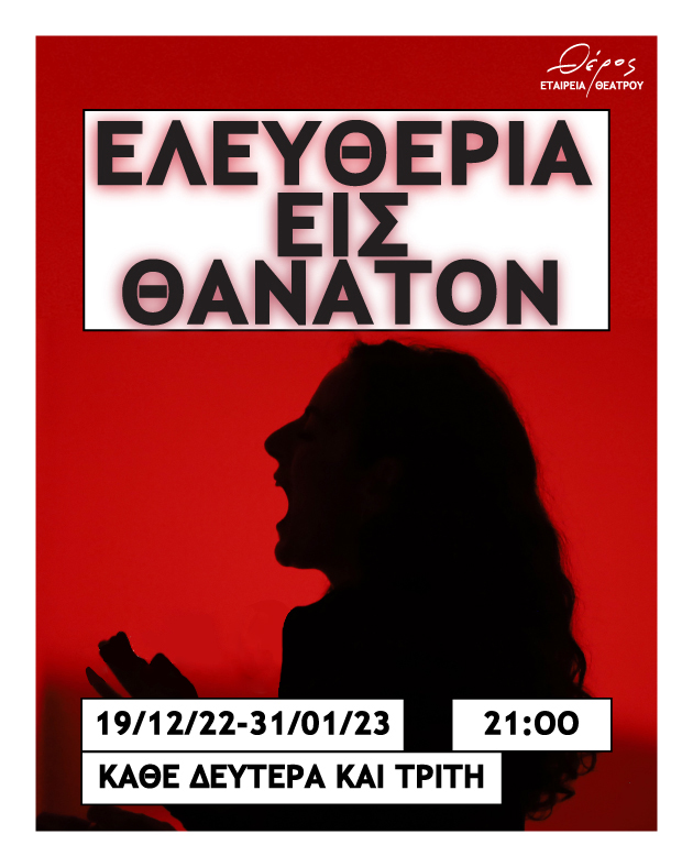 Η πρόσφατη θεατρική παραγωγή της «Θέρος», «Ελευθερία εις Θάνατον», σε σκηνοθεσία Ηλέκτρας Ελληνικιώτη, θα παρουσιαστεί στο Μικρό Θέατρο Κεραμεικού για 14 παραστάσεις από τις 19 Δεκεμβρίου 2022 έως τις 31 Ιανουαρίου 2023.