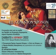 The composer Anastasia Guy mentioned:The Oratorio "IN INTAINTED TIME" is a glorious and panegyric hymn with an abstract structure that reflects the realistic and objective values of that time. Furthermore, emphasizes the timeless values of freedom and competitiveness. It is inspired by ancient Greek, artistic and modern rhythms that alternate, depending on the poetic conception of each part". Art Director: Violeta CacomanoliSoloists: Kalliopi Vetta, Marios Andreou, Anastasia GuyThe "Melodia" Vocal Ensemble of the Limassol-Cyprus Literary SocietyThe "Orpheus" Tripoli' s ChorusThe Chorus of Music Society of SpartaConductresses: Christina Athanasopoulou, Violeta Cacomanoli Narration: Maria Yiatrou