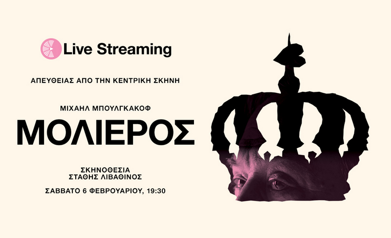 Το Εθνικό Θέατρο συνεχίζει τον προγραμματισμό του για το 2021 παρουσιάζοντας ένα από τα σημαντικότερα θεατρικά έργα του Ρώσου συγγραφέα Μιχαήλ Μπουλγκάκοφ (1891-1940), Μολιέρος, σε σκηνοθεσία Στάθη Λιβαθινού. H παράσταση κάνει πρεμιέρα το Σάββατο 6 Φεβρουαρίου σε live streaming από την Κεντρική Σκηνή του Εθνικού Θεάτρου.