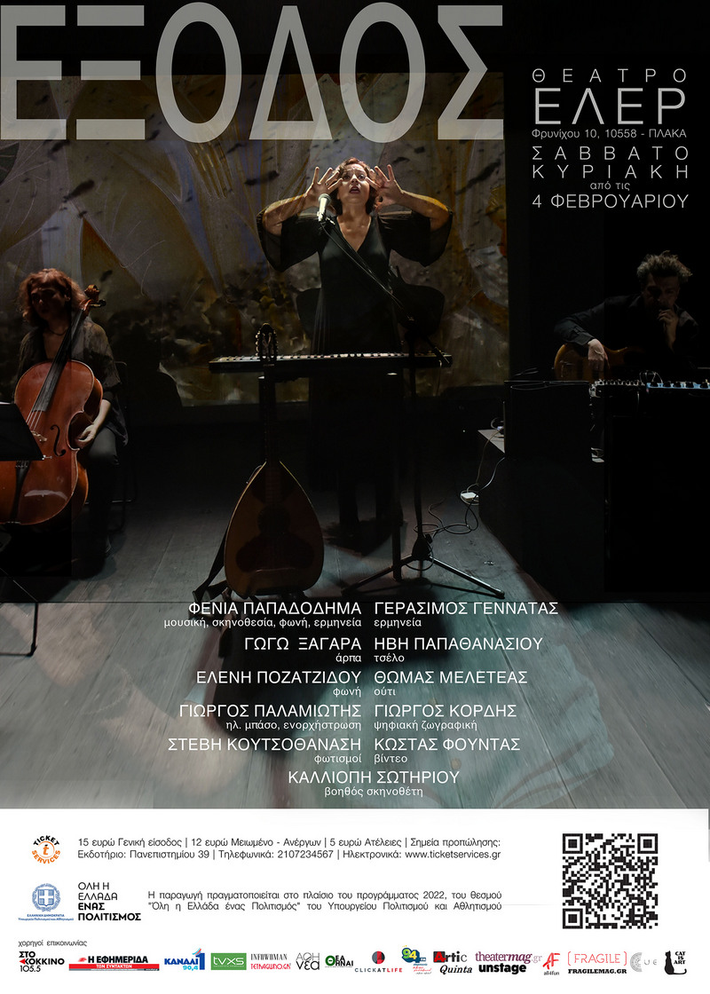 Η παράσταση «Έξοδος» είναι ένα μουσικό ονειρικό ταξίδι στη φρίκη της μικρασιατικής καταστροφής, στο υποσυνείδητο ενός λαού που βίωσε έναν αβυσσαλέο σωματικό και πνευματικό βιασμό, μέσα από το βλέμμα και τον τρόπο του Γιώργου Σεφέρη.