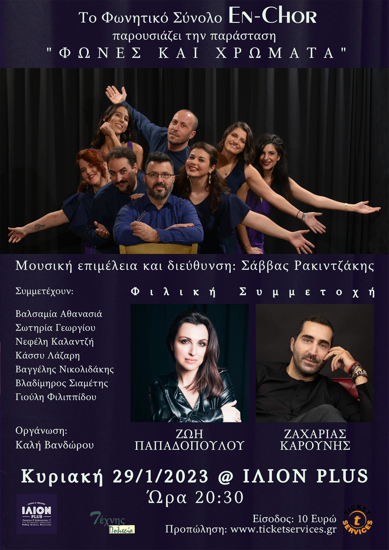 Με οδηγό τη φαντασία, τον ρυθμό και την αγάπη για τη μουσική, το φωνητικό σύνολο En-Chor έρχεται στο Ίλιον Plus με την παράσταση «Φωνές και χρώματα». Μέσα από τις πρωτότυπες χορωδιακές επεξεργασίες του μαέστρου Σάββα Ρακιντζάκη, το En-Chor παρουσιάζει ένα πρόγραμμα με ποικίλο περιεχόμενο. Οι πέντε γυναικείες και οι δύο αντρικές φωνές του συνόλου, ενώνονται με έναν μαγικό τρόπο, χαρίζοντας ένα αποτέλεσμα που μόνο αναμενόμενο δεν μπορεί να χαρακτηριστεί…