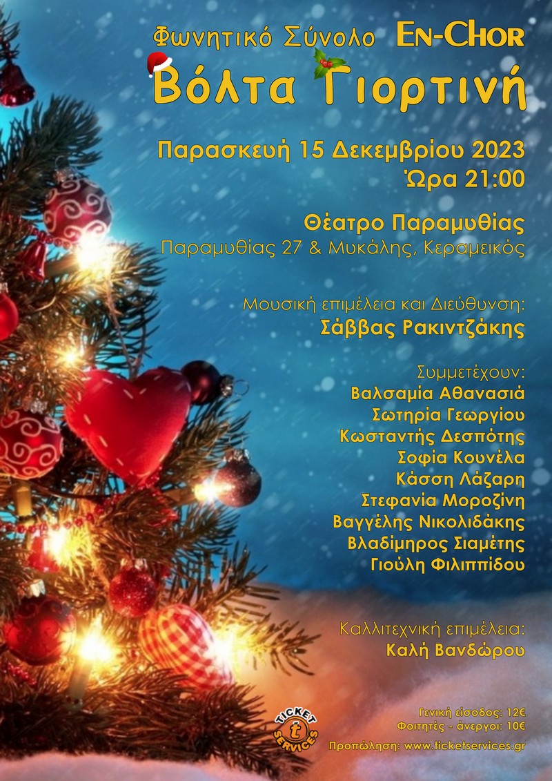 Την Παρασκευή 15 Δεκεμβρίου 2023 στο Θέατρο Παραμυθίας γνωστές επιτυχίες από διαφορετικές εποχές «σμίγουν» και «στήνουν» επί σκηνής ένα πρόγραμμα με αναφορές σε χριστουγεννιάτικες μελωδίες από όλο τον κόσμο, αλλά και αγαπημένα γνωστά ελληνικά τραγούδια. Το «Rocking around the Christmas tree» και το «Deck the halls with boughs of holly» θα συναντήσουν το «Η Λίζα και η κορνίζα» και το «Τρίτο στεφάνι», ενώ ο Bobby Helms και η Mariah Carey θα ανταμώσουν με τη Μαρίζα Ρίζου και την Πένυ Μπαλτατζή...