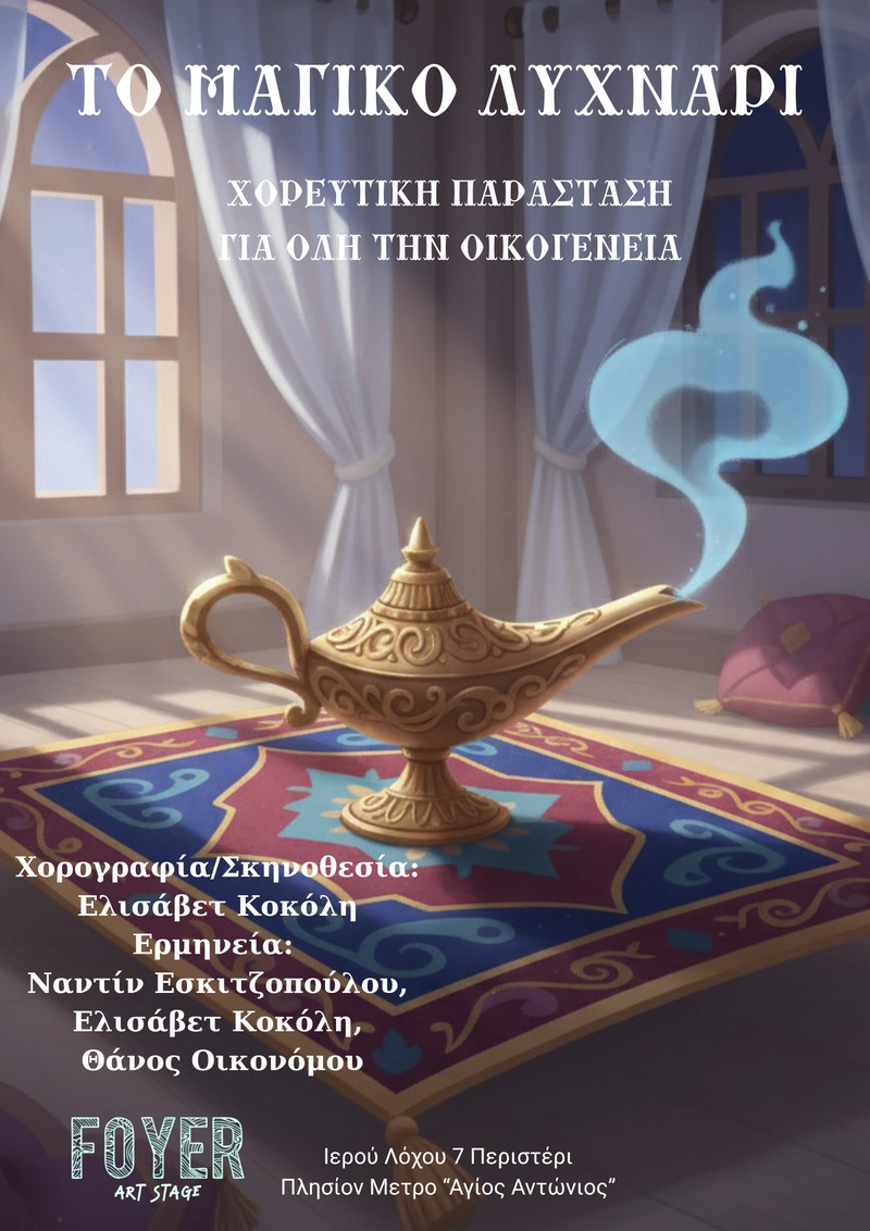 Μαγικά λυχνάρια, τζίνι και μαγικά χαλιά μας ταξιδεύουν στον μαγικό κόσμο της Ανατολής με τους παραμυθένιους ήρωες να μπλέκουν από περιπέτεια σε περιπέτεια. Μια παράσταση που εμπνεύστηκε χορογράφησε και σκηνοθέτησε η Ελισάβετ Κοκόλη