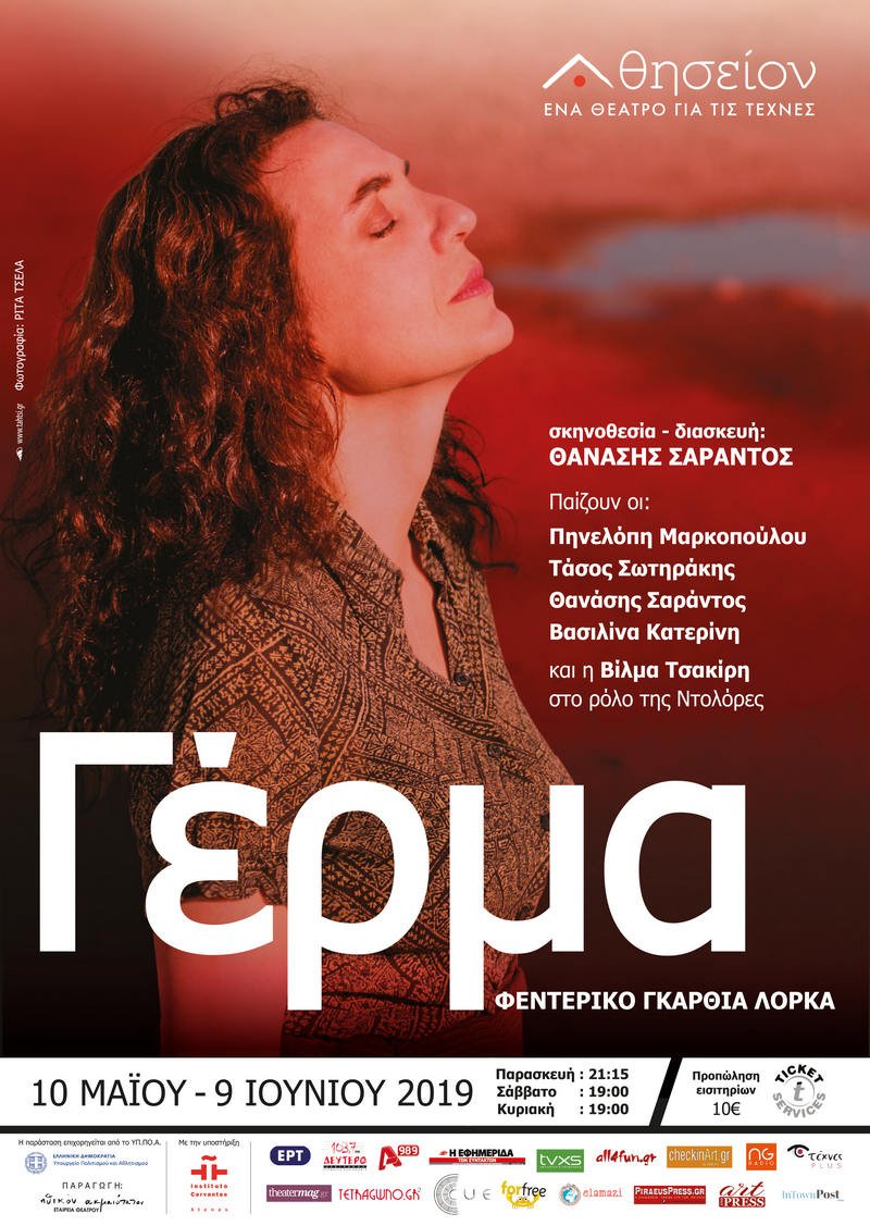 Η «ΓΕΡΜΑ», το εμβληματικό έργο του Φεντερίκο Γκαρθία Λόρκα σε σκηνοθεσία - διασκευή Θανάση Σαράντου, που επιδοκιμάστηκε από θεατές και κριτικούς, ολοκληρώνει τις παραστάσεις του στο θησείον, ΈΝΑ ΘΕΑΤΡΟ ΓΙΑ ΤΙΣ ΤΕΧΝΕΣ την Κυριακή 9 Ιουνίου 2019. Ο Θανάσης Σαράντος και η Εταιρία Θεάτρου «ηθικόν ακμαιότατον» παρουσιάζουν για περιορισμένο αριθμό παραστάσεων, μία διασκευή της «Γέρμα» για 5 πρόσωπα, που βιώνουν τον λορκικό μύθο σ' ένα ελληνικό ακριτικό χωριό της Ηπείρου εν έτει 2019.