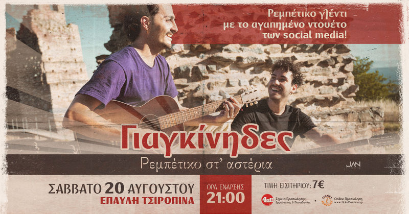 Οι Γιαγκίνηδες υπόσχονται στους κατοίκους και τους επισκέπτες της Σύρου, μία γιορτή του ρεμπέτικου κάτω από τα αστέρια, όπου το κέφι, ο χορός και οι φωνές του κόσμου θα πρωταγωνιστήσουν. Η τιμή του εισιτηρίου ορίστηκε στα 7€ για να δώσει τη δυνατότητα σε όλους και όλες να παρευρεθούν στο πιο νεανικό «ρεμπέτικο γλέντι» του καλοκαιριού.